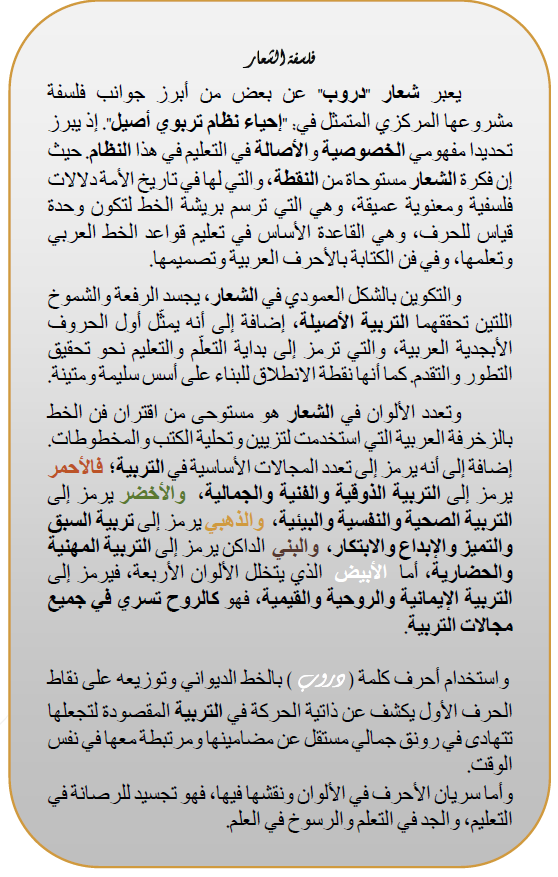 وتعدد الألوان في الشعار هو مستوحى من اقتران فن الخط بالزخرفة العربية التي استخدمت لتزيين وتحلية الكتب والمخطوطات. إضافة إلى أنه يرمز إلى تعدد المجالات الأساسية في التربية؛ فالأحمر يرمز إلى التربية الذوقية والفنية والجمالية، والأخضر يرمز إلى التربية الصحية والنفسية والبيئية، والذهبي يرمز إلى تربية السبق والتميز والإبداع والابتكار، والبني الداكن يرمز إلى التربية المهنية والحضارية، أما الأبيض الذي يتخلل الألوان الأربعة، فيرمز إلى التربية الإيمانية والروحية والقيمية، فهو كالروح تسري في جميع مجالات التربية.